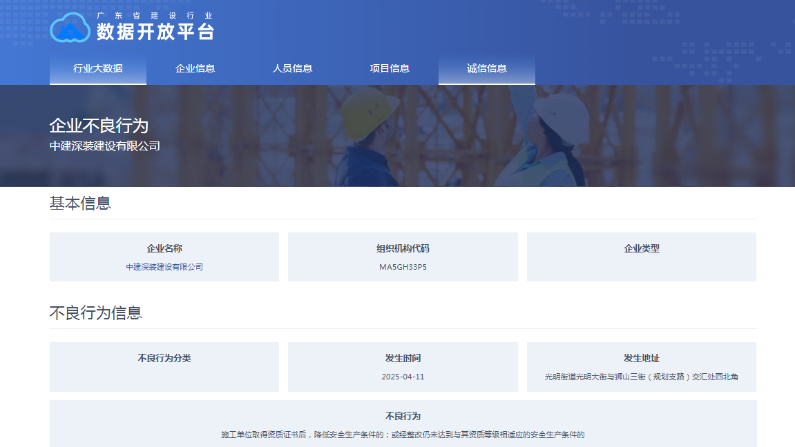 据悉,处罚机关核查认定该单位降低了安全生产条件,已不再符合《建筑施工企业安全生产许可证管理规定》第四条第(六)、(八)、(九)、(十)项 等规定。对此,广东省住房和城乡建设厅依据《建设工程安全生产管理条例》第六十七条,《建筑施工企业安全生产许可证管理规定》第二十三条,于8月 18日对其发出行政处罚决定书粤建质罚〔2025〕132号。 齐鲁晚报·齐鲁壹点记者于广东省建设行业数据开放平台获悉,8月18日,中建深圳装饰有限公司(下称"中建深装")旗下的中建深装建设有限公司(下 称"中建深装建设")收到罚单,其不良行为是"施工单位取得资质证书后,降低安全生产条件的;或经整改仍未达到与其资质等级相适应的安全生产条件 的"。 | 广 东 省 建 设 行 业 数据开放平台 | | | | | | | --- | --- | --- | --- | --- | --- | | 行业大数据 | 企业信息 | 人员信息 | 项目信息 | 诚信信息 | | | 企业不良行为 中建深装建设有限公司 | | | | | | | 基本信息 | | | | | | | 企业名称 中建深装建设有限公司 | | | 组织机构代码 MA5GH3 ...