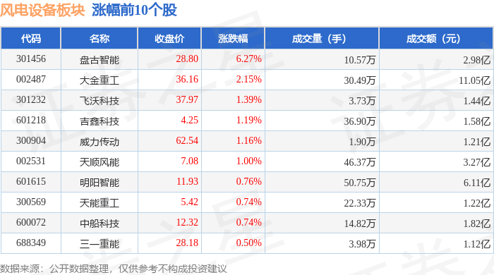 风电设备板块市场表现 - 风电设备板块整体下跌1.12% 领跌个股为电气风电(下跌5.04%)[1] - 上证指数下跌1.25%至3765.88点 深证成指下跌2.83%至12118.7点[1] - 板块内10只个股上涨 10只个股下跌 呈现分化态势[1][2] 个股涨跌情况 - 涨幅居前个股:盘古智能上涨6.27%至28.8元 大金重工上涨2.15%至36.16元 飞沃科技上涨1.39%至37.97元[1] - 跌幅显著个股:双一科技下跌4.6%至33.77元 新强联下跌3.93%至33.75元 海力风电下跌3.83%至75元[2] - 成交额前列个股:明阳智能成交6.11亿元 电气风电成交11.25亿元 金风科技成交8.22亿元[1][2] 资金流向分析 - 板块主力资金净流出2.33亿元 游资净流入4072.48万元 散户净流入1.92亿元[2] - 大金重工获主力资金净流入1.31亿元(占比11.9%)明阳智能获主力净流入4329.42万元(占比7.08%)[3] - 运达股份获游资净流入5034.83万元(占比8.44%)天顺风能遭游资净流出2416.1万元(占比7.4%)[3]