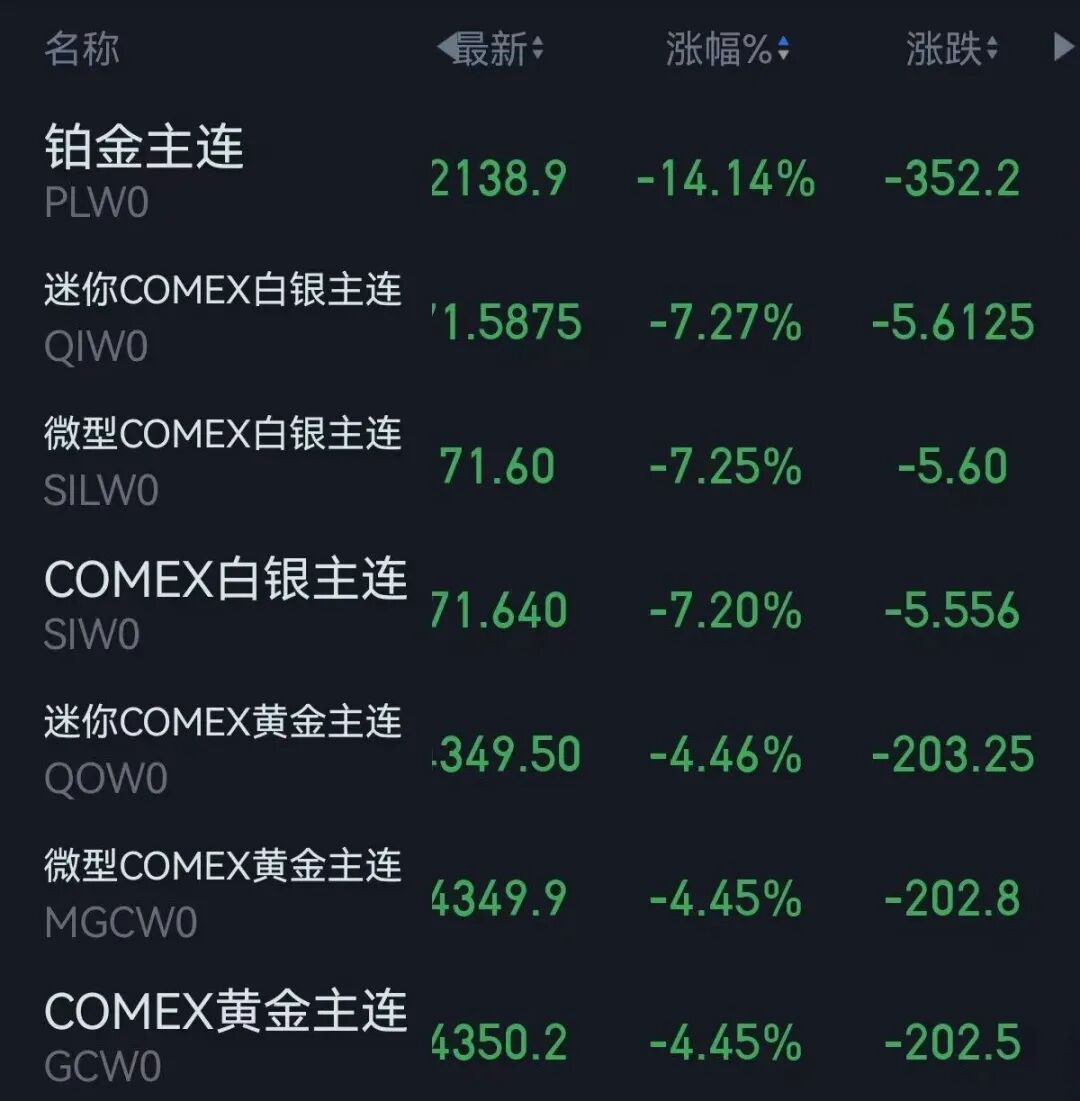 对于这个现象之前我就说过,尤其是当时提出了黄金的滞涨,从某种程度来说,此前一直是黄金比较强势,而后来直接被白银抢了风头,还有一点,就是白 银上涨的时候,黄金属于被动式的跟涨,那么白银如果出现大跌,黄金的跌幅也一定不会小,果然昨晚这些说法都全部兑现了。 除了白银之外,金价的振幅也不小,收盘时纽约黄金期货最终下跌幅度达到了4.6%,盘中最低到了4316美元,应该说黄金期货昨天的大阴线吞吃了过去十 个交易日的上涨,当然了铜期货的大跌幅度也达到了5%,昨夜整个贵金属处于集体的大跳水之中。 昨夜,外盘又崩了,单日亏损16% 先来看看昨夜外盘的情况,白天无论是白银还是黄金,或者说铜和铝,如果说跳水的话,还仅仅是相对早盘的上涨出现的获利回吐,然而到了晚间一切就变 得不寻常起来,白银期货的跌幅最大,到今年凌晨3点时候最大跌幅达到了9%,而昨天早盘的最大涨幅达到了7%,这就相当于一天时间的振幅达到了16%, 盘中最低到了70美元,坦率的说,这会让多头承受比较明显的压力。 当然了从这波白银价格的大涨根本属性看,主要还是工业需求增加以及保值增值的作用,如果仅仅是工业需求的话,我想是不足以演化到今天的这种地步, 实际上白银期货从64 ...