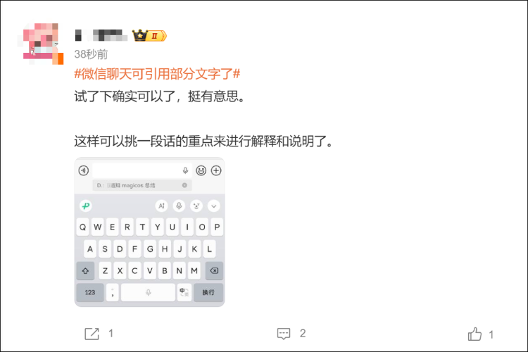 微信新功能更新 核心功能升级 - 新增文字引用功能 支持选择性引用好友或本人发送的文字片段 仅显示用户选择的部分内容 [1][5] - 扩展回复形式 支持通过表情包 照片 文字 语音进行引用回复 [1][5] - 优化语音交互 新增语音引用选项 [3] 用户体验优化 - 精准引用功能提升工作场景效率 减少细节引用错误 [7] - 生活场景中增强互动性 便于延续好友间的梗或话题 [7] - 用户可手动选择需引用的精华文字段落 界面仅展示选定内容 [5] 用户反馈与互动 - 网友认可功能改进 认为聊天精准度显著提升 [7] - 平台通过评论区收集用户对新功能的期待建议 [9]