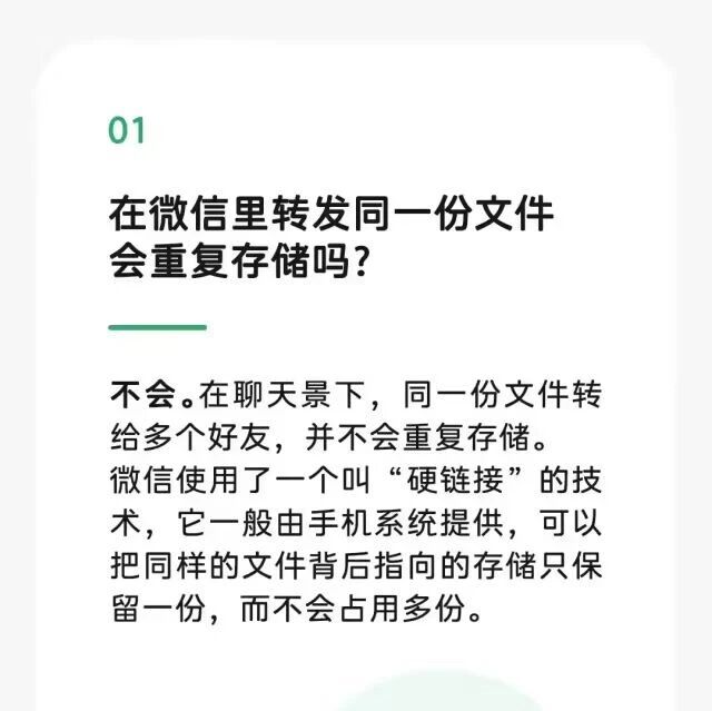 文章核心观点 - 微信官方针对用户关于其占用手机存储空间的常见误解进行了集中澄清,并详细阐述了其技术原理、优化措施及存储管理工具,核心在于解释存储占用的真实构成、强调聊天记录是主要空间占用源,并说明公司为优化存储体验所做的持续努力 [1][7][16][18] 技术原理澄清 - 转发文件不会重复占用存储,公司采用手机系统提供的“硬链接”技术,确保同一文件在存储中只保留一份 [1] - 删除聊天记录后不会继续占空间,公司采用“异步删除”机制,先标记数据,在手机空闲时后台清理,以保障聊天体验不受打断 [3] - 过期文件不占用本地存储空间,所谓“找回过期文件”的方法无效,因为文件未被下载或已被主动清理 [5] - 自动下载功能旨在确保作为“主设备”的手机接收尽可能完整的聊天记录,关闭此功能可能牺牲体验,导致手机上出现更多“已过期”的媒体文件 [9] 存储占用与安装包 - 微信安装包体积增长是功能丰富的客观结果,包含更多代码、逻辑及资源,但安装包不会无限增长,且安卓版安装包体积已在持续下降 [11] - “必要文件”指删除会影响软件运行(如导致闪退或功能不可用)的文件,包括业务代码、用户配置数据和高频使用的基础功能数据,公司正持续优化以减少其占用 [13] - 许多新增功能(如小程序、朋友圈、视频号)产生的数据属于“缓存”,可被删除且不影响功能使用,缓存数据有占用上限和自动清理机制 [15] 存储空间管理优化 - 聊天记录是存储空间占用的主要来源,对于占用空间40GB以上的用户,聊天记录平均占比达70% [16] - 公司优化了聊天记录的存储方式,并提供了更高效的清理工具,所有优化以保证用户数据绝不丢失为前提 [18][19] - 提供一键清理“原图、原视频”功能,批量清理后保留普通画质版本以节省空间 [20] - 避免相册重复保存,当尝试再次保存已保存过的图片视频时,软件会提示“已保存过” [20] - 文件支持“先预览,后下载”,避免为预览PDF、Word等文件而永久留存 [20] - 后台持续对历史文件进行技术去重与合并 [20] - 优化编码压缩工具,在保证体验的前提下节省图片视频的存储占用 [20] - 清理工具支持按文件大小排序,数据显示50MB以上的大文件数量仅占2%,却占了70%的体积,便于用户快速清理 [20] - 提供更细的筛选维度,如“筛选手机相册里已有的图片/视频”,避免数据重复存储 [20] - 调整空间不足提醒弹窗,将触发阈值优化至700MB(iOS)或最高1GB(Android),使提醒触发次数降低了约90%,并增加“前往清理手机系统存储”的选项 [7][20] - 清理入口更清晰,将“其他账号”、“资源文件”等从不可清理类别中单独列出并提供入口,同时使“存储空间”入口更浅、加载更快 [20]