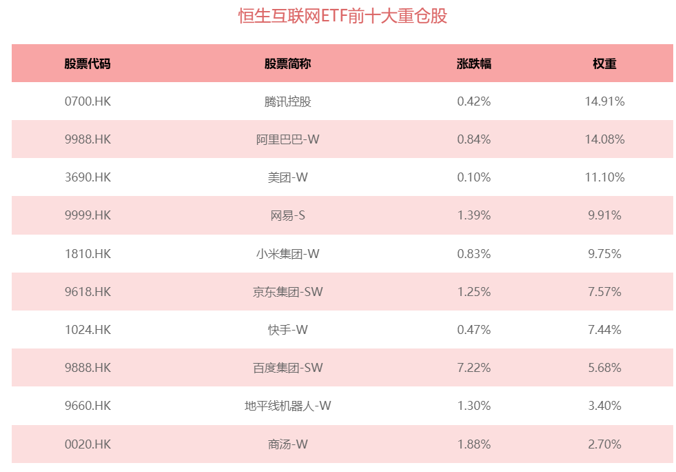 市场资金动向 - 上一交易日(12月29日),恒生互联网ETF(513330)获得融资净买入2894.11万元 [1] - 当日获得融资大额加仓的其他ETF包括证券ETF、恒生科技指数ETF、港股创新药ETF、有色金属ETF、卫星ETF等 [1] - ETF在连续调整后出现融资大额流入,通常被视为积极迹象,表明有先知先觉的资金开始认可当前位置的投资价值 [2] 恒生互联网ETF产品概况 - 该ETF(513330.SH)跟踪恒生互联网科技业指数,成分股汇集港股市场主要互联网公司 [2] - 产品在上海证券交易所上市,支持T+0日内灵活交易 [2] - 该ETF对应的联接基金C份额代码为013172.OF [2] 指数估值与成分股表现 - 当前恒生互联网科技业指数的市盈率(PE-TTM)为22.87倍,远低于A股TMT板块,具备性价比优势 [2] - 指数前十大成分股包括腾讯控股(权重14.91%,涨0.42%)、阿里巴巴-W(权重14.08%,涨0.84%)、美团-W(权重11.10%,涨0.10%)、网易-S(权重9.91%,涨1.39%)、小米集团-W(权重9.75%,涨0.83%)、京东集团-SW(权重7.57%,涨1.25%)、快手-W(权重7.44%,涨0.47%)、百度集团-SW(权重5.68%,涨7.22%)、地平线机器人-W(权重3.40%,涨1.30%)、商汤-W(权重2.70%,涨1.88%)[3]