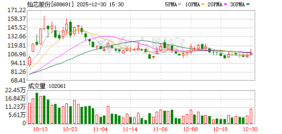 公司股票交易情况 - 12月30日,公司通过大宗交易平台发生2笔成交,合计成交量17.29万股,成交金额1849.41万元,成交价格均为106.94元,相对当日收盘价折价1.50% [2] - 近3个月内,公司累计发生38笔大宗交易,合计成交金额为4.12亿元 [3] - 12月30日,公司股票收盘价为108.57元,上涨4.49%,日换手率为14.28%,成交额为11.22亿元 [3] 公司资金流向与融资情况 - 12月30日,公司全天主力资金净流入4254.56万元 [3] - 近5日,公司股票累计上涨2.81%,资金合计净流入3825.49万元 [3] - 公司最新融资余额为4.99亿元,近5日增加2238.42万元,增幅为4.70% [4] 公司基本信息 - 公司全称为灿芯半导体(上海)股份有限公司,成立于2008年07月17日,注册资本为12000万人民币 [4]