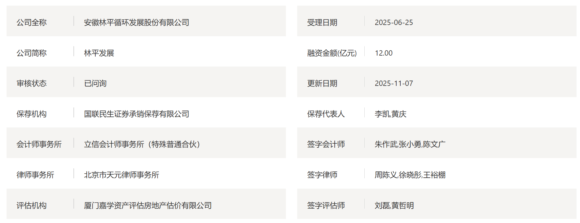 公司基本情况 - 公司全称为安徽林平循环发展股份有限公司,简称林平发展,主要从事包装用瓦楞纸、箱板纸的研发、生产和销售 [2] - 公司是一家集废纸利用、热电联产、绿色造纸于一体的资源综合利用企业,并被认定为高新技术企业 [2] - 公司保荐机构为国联民生证券承销保荐有限公司,会计师事务所为立信会计师事务所 [2] 财务表现 - 公司营业收入连续两年走低,2022年至2024年营收分别为28.79亿元、28.00亿元、24.85亿元,2025年上半年营收为12.24亿元 [3][4] - 公司净利润存在波动,2022年至2024年净利润分别为1.54亿元、2.12亿元、1.53亿元,2025年上半年净利润为9141.90万元 [4] - 公司资产总额呈增长趋势,从2022年末的18.47亿元增长至2025年6月末的25.48亿元 [5] - 公司资产负债率从2022年末的49.56%下降至2025年6月末的43.62% [5] 业务与运营 - 公司主营业务收入高度集中于瓦楞纸和箱板纸,报告期内该部分收入占比超过99%,其中箱板纸收入占比约70% [6] - 报告期内公司核心产品单价呈下降趋势 [3][6] - 2023年收入下降主要因国内取消成品纸进口关税导致进口量增加、产品售价下降,但公司箱板纸6600生产线投产使销量增加 [6] - 2024年收入下滑主要因下游消费市场需求疲软、产品售价继续下降,以及台风导致停产超过30天 [6] - 公司表示产品市场价格的变动可传导至原材料采购价格,主要产品单位成本与售价同向变动,毛利率未受不利影响 [7] 税收优惠 - 报告期内公司税收优惠金额占净利润的比例分别为63.02%、68.65%、80.58%,呈递增趋势 [8][9] - 税收优惠中资源综合利用企业增值税即征即退金额较大,监管层关注其可持续性 [9] - 公司回应称相关政策在有效期内变化可能性小,税收优惠具有可持续性 [9] - 与同行业公司相比,公司税收优惠占净利润比例与荣晟环保、森林包装相当,处于行业正常水平 [9]