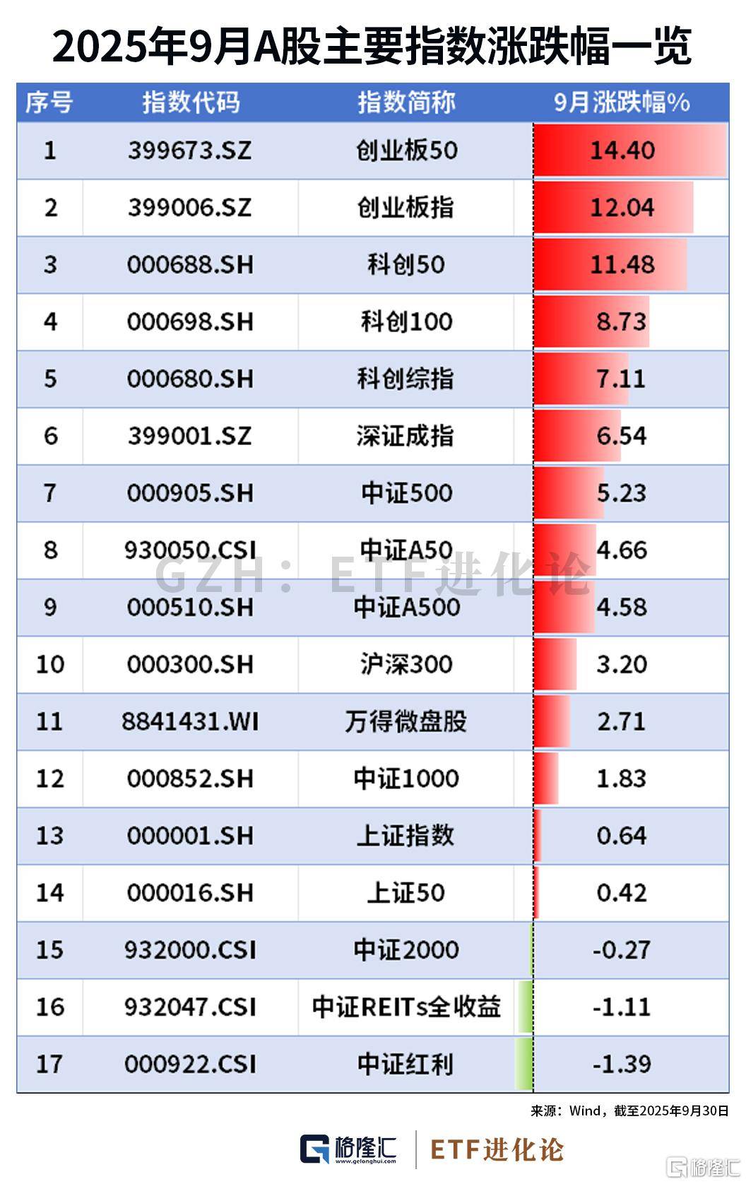 9月30日,A股大盘红盘震荡顺利收官,上证指数涨0.52%,深证成指涨0.35%,创业板指持平,在9月分别涨0.64%,6.54%和12.04%。三大指数均连涨5个 月,其中创业板指三季度涨幅超50%,创历史第二好成绩。 | 序号 | 指数代码 | 指数简称 | 9月涨跌幅% | | --- | --- | --- | --- | | 1 | 399673.SZ | 创业板50 | 14.40 | | 2 | 399006.SZ | 创业板指 | 12.04 | | 3 | 000688.SH | 科创50 | 11.48 | | 4 | 000698.SH | 科创100 | 8.73 | | 5 | 000680.SH | 科创综指 | 7.11 | | 6 | 399001.SZ | 深证成指 | 6.54 | | 7 | 000905.SH | 中证500 | 5.23 | | 8 | 930050.CSI | 中证A50- | 4.66 | | 9 | 000510.SH | 中证A500 | 4.58 | | 10 | 000300.SH | 沪深300 | 3.20 | | 11 | 88414 ...