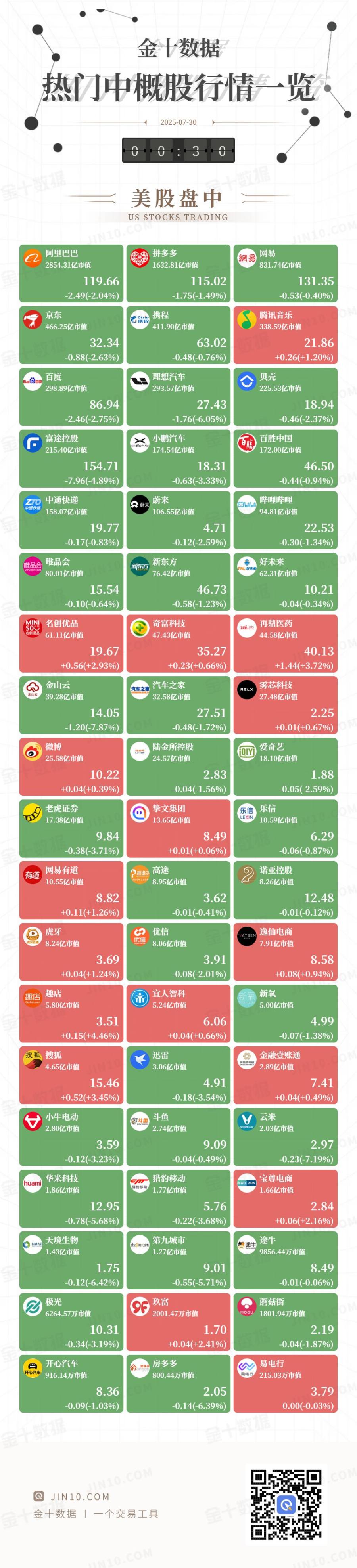 金十图示:2025年07月29日(周二)热门中概股行情一览(美股盘中) 158.07亿市值 106.55亿市值 94.81亿市值 19.77 4.71 22.53 -0.17(-0.83%) -0.12(-2.59%) -0.30(-1.34%) 新东方 (ALHAR ) 好未来 唯品会 唯品会 葡萄方 80.01亿市值 62.31亿市值 76.42亿市值 10.21 15.54 46.73 -0.10(-0.64%) -0.58(-1.23%) -0.04(-0.34%) MINI 名创优品 S000 61.11亿市值 再鼎医药 C ) 荷富科技 zai 47.43亿市值 44.58亿市值 19.67 35.27 40.13 +0.56(+2.93%) +0.23(+0.66%) +1.44(+3.72%) 雾芯科技 金山本 == RELX 39.28亿市值 32.58亿市值 27.48亿市值 2.25 27.51 14.05 -1.20(-7.87%) -0.48(-1.72%) +0.01(+0.67%) 陆金所控股 illy) 爱奇艺 O 微博 LU som 25.58亿市值 24.57亿市值 18. ...