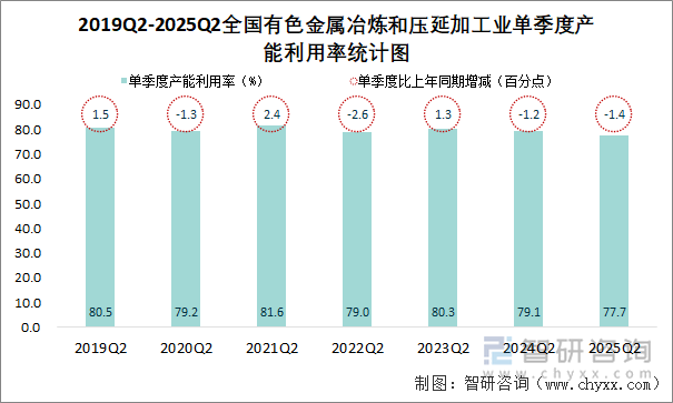数据来源:国家统计局 数据来源:国家统计局 2025年第二季度,全国有色金属冶炼和压延加工业单季度产能利用率为77.7%,单季度比上年同期下降 1.4个百分点;2025年上半年,全国有色金属冶炼和压延加工业累计产能利用率为77.6%,累计比上年同 期下降1.1个百分点。 相关报告:智研咨询发布的《2025-2031年中国有色金属冶炼和压延加工行业市场动态分析及未来趋势 研判报告》 ...