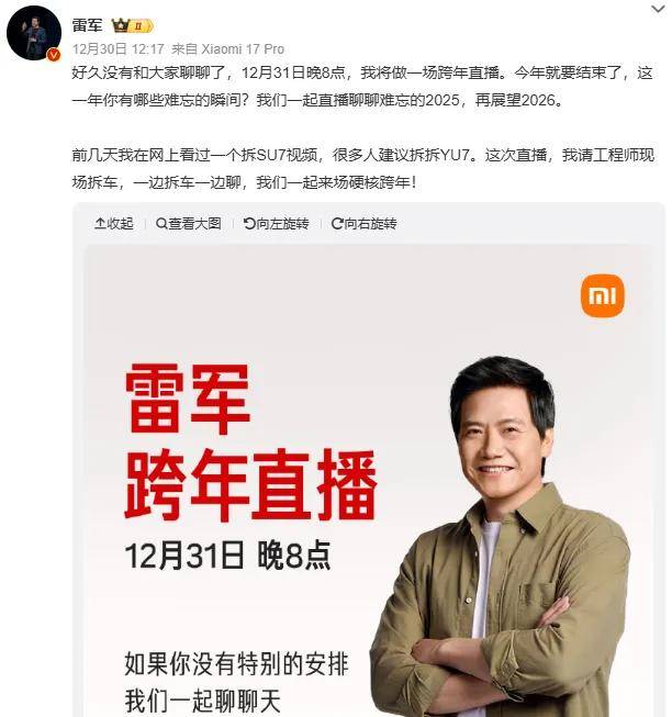 年底了,互联网大佬们排着队搞事,昨晚,罗永浩"科技春晚"承包了热搜,而小米同时宣布,雷军将在 12月31日晚进行跨年直播、拆车。 雷军表示,好久没有和大家聊聊了,12月31日晚8点,我将做一场跨年直播。今年就要结束了,这一年 你有哪些难忘的瞬间?我们一起直播聊聊难忘的2025,再展望2026。 同时,他还表示:前几天我在网上看过一个拆SU7视频,很多人建议拆拆YU7。这次直播,我请工程师 现场拆车,一边拆车一边聊,我们一起来场硬核跨年! 不过,刚刚雷军发文称,这场直播要推迟了,并给米粉道歉。 雷军表示:实在抱歉,我感冒有点严重,原定跨年的直播只能推迟到 1月3日晚7点。提前祝大家新年快 乐!我给大家准备了一点心意,转发本条微博,抽送15台小米17 Ultra。 还有网友表示:以后发布的新车,建议老板都直播拆一下,让消费者看见你们的用料,一辆车用的什么 材料?怎么设计的?这么做的原因是什么?都可以在直播过程中讲清楚。真材实料的车,让消费者用着 更安心,第三方拆车也应该得到鼓励,只要不是恶意抹黑 。 据了解,雷军此次首次公开拆解小米YU7汽车,意在用"硬核"方式直面行业质疑,引发全网对汽车透明 化与安全设计的关注 ...