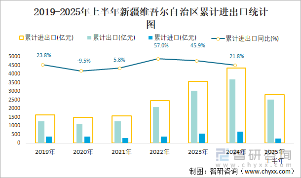 2025年上半年新疆维吾尔自治区贸易统计分析:新疆维吾尔自治区进出口总额为2808.2亿元,同比增长28%
