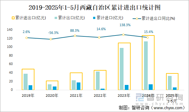 2025年1-5月西藏自治区贸易统计分析:西藏自治区进出口总额为38.5亿元,同比增长13.2%