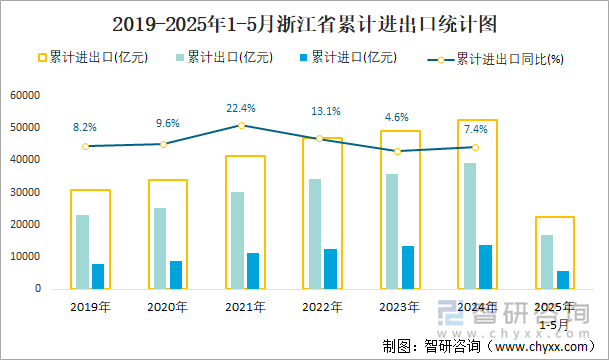 2025年1-5月浙江省贸易统计分析:浙江省进出口总额为22390.2亿元,同比增长6.5%