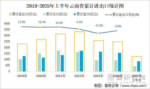 2025年上半年云南省贸易统计分析:云南省进出口总额为1273.9亿元,同比增长3.2%