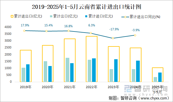 2025年1-5月云南省贸易统计分析:云南省进出口总额为1031.2亿元,同比增长1.8%