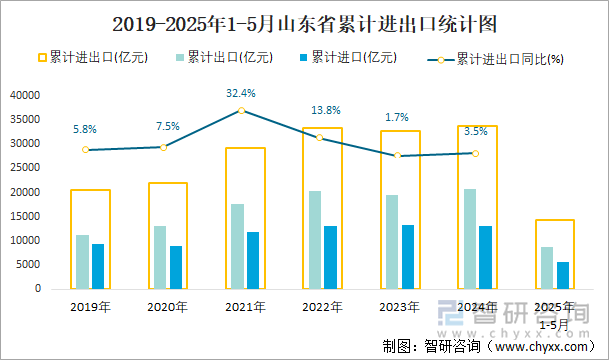 2025年1-5月山东省贸易统计分析:山东省进出口总额为14241.1亿元,同比增长7.7%