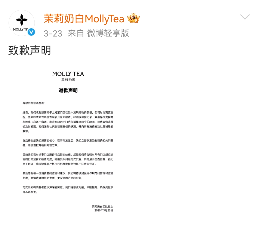 茉莉奶白致歉!奶茶喝出完整塑料袋,开放加盟两年扩张近千门店