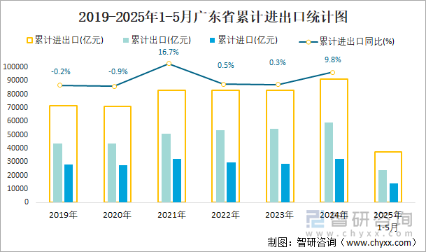 2025年1-5月广东省贸易统计分析:广东省进出口总额为37458.9亿元,同比增长4%
