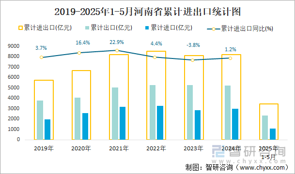 2025年1-5月河南省贸易统计分析:河南省进出口总额为3430亿元,同比增长27%