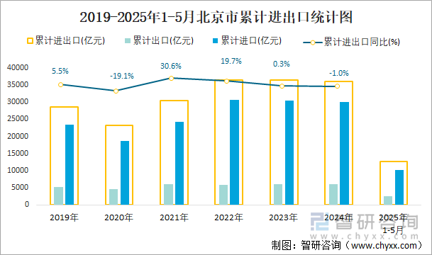 2025年1-5月北京市贸易统计分析:北京市进出口总额为12667亿元,同比下滑18.6%