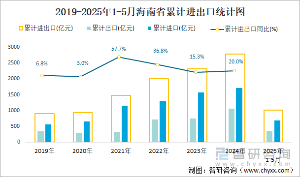 2025年1-5月海南省贸易统计分析:海南省进出口总额为1017.8亿元,同比下滑6%