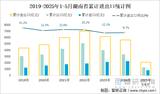 2025年1-5月湖南省贸易统计分析:湖南省进出口总额为2112.8亿元,同比下滑10.9%