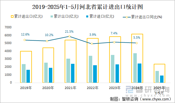 2025年1-5月河北省贸易统计分析:河北省进出口总额为2372.1亿元,同比下滑7.3%