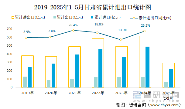 2025年1-5月甘肃省贸易统计分析:甘肃省进出口总额为295.2亿元,同比增长43.2%