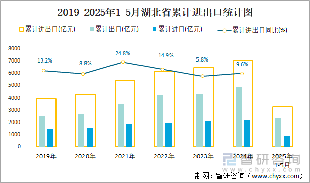 2025年1-5月湖北省贸易统计分析:湖北省进出口总额为3287.4亿元,同比增长26.9%