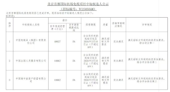 | 01 标度: | | | | | | | | | --- | --- | --- | --- | --- | --- | --- | --- | | 标准 | 中标候选人名称 | 我份 背年保底经营 费(万元) | 瓦卡 捕任 原長成比 例 | 经营用系 | 原量 | 使將到查院 应情况。 | 守审情况 | | | 中国免税品(集团)有限责 任公司 | 48027 | 5% | 自会同约定的 起始日起至 2034年2月10 日止(不超过 | 满足超 标文件 类求 | 完全清是 | 满足裕标文件规定的实质性要求, 烧合评分第一 | | | | | | 8年) | | | | | 2 | 中国出国人页服务有限公司 | 44662 | 5% | 自音同的定的 船给日起至 2034年2月10 日止(不超过 8年) | 两层招 标文件 蛋点 | 完全清是 | 满足裕春文营规定的实用性基求。 综合评分排名第二 | | 3 | 中国港中禁资产经营有限公 क | 44662 | 5% | 包合同约定的 尼始日起至 20349-2月10 日止(不是过 8年) | 商足相 专文件 更常 | 完全清足 | 满足都标文件规发的实 ...