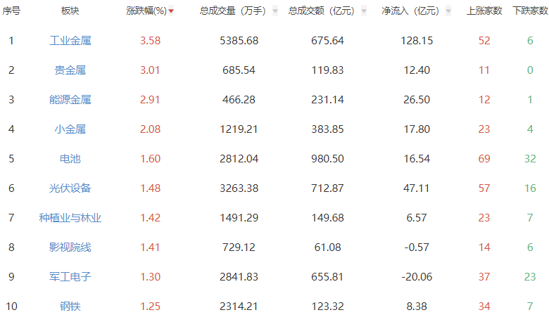 A股市场板块涨跌幅排行 中国经济网北京12月26日讯 沪指、创指午后翻红,深证成指继续上行。截至收盘,上证指数报3963.68 点,上涨0.10%,成交额8936.44亿元;深证成指报13603.89点,上涨0.54%,成交额12665.47亿元;创业板指报 3243.88点,上涨0.14%,成交额5713.14亿元。 | 序号 | 板块 | 涨跌幅(%)▼ | | 总成交量(万手) = 总成交额(亿元)▼ | 净流入 (亿元) ▼ | 上涨家数 | 下跌家数 | | --- | --- | --- | --- | --- | --- | --- | --- | | 1 | 工业会屋 | 3.58 | 5385.68 | 675.64 | 128.15 | 52 | ଚ | | 2 | 需要遇 | 3.01 | 685.54 | 119.83 | 12.40 | 11 | 0 | | 3 | 説得等 | 2.91 | 466.28 | 231.14 | 26.50 | 12 | 1 | | র্ব | 小我屋 | 2.08 | 1219.21 | 383.85 | 17.80 | 23 | ব | | 5 | ...