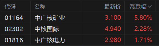 港股核电股拉升上涨,其中,中广核矿业涨5.8%,中核国际涨2.28%,中广核电力涨1%。 据观察,如此紧凑的新机组开工在史上并不多见,这一方面与中广核作为国内最大核电企业的项目储备 有关,2024年、2025年,中广核获得核准的核电新机组均领跑其他核电集团,另一方面也是国内核电建 设重回高峰的缩影。业内预测,"十五五"时期,中国有望成为全球唯一商运核电机组破百的国家。 | 代码 | 名称 | 最新价 | 涨跌幅 × | | --- | --- | --- | --- | | 01164 | 中广核矿业 | 3.100 5.80% | | | 02302 | 中核国际 | 4.940 2.28% | | | 01816 | 中广核电力 | 2.980 1.71% | | 消息上,临近年末、满弓紧弦,核电开工潮再起。据澎湃获悉,中广核福建宁德核电站6号机组12月16 日完成核岛第一罐混凝土浇筑(FCD),标志着该机组主体工程正式开工。11月18日、19日,位于浙江 温州的三澳核电站3号机组和位于山东烟台的招远核电站1号机组相继FCD。 ...