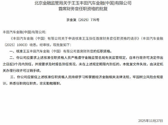 公司人事任命 - 北京金融监管局于12月5日核准了王玉担任丰田汽车金融(中国)有限公司首席财务官的任职资格 [1][2]