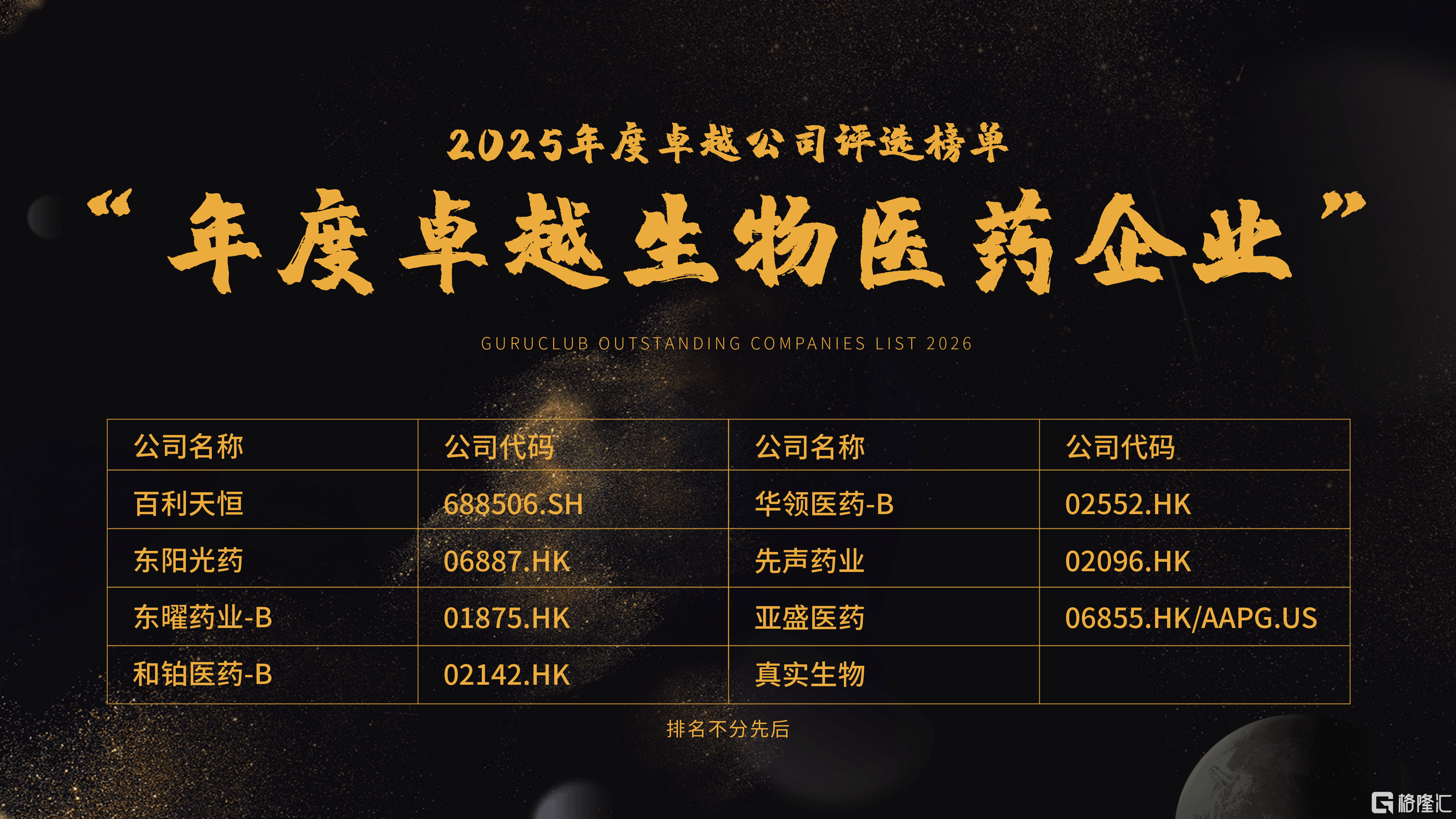 "年度卓越生物医药企业"是从技术创新、研发实力、成果转化等多方面综合评估,旨在表彰在生物医药领域具有自主核心技术、持续创新并能高效将科研成 果转化为临床或商业应用的领军企业。本次评选通过定量数据分析和专家评审团等方式得出最终结果。 格隆汇以"全球视野,下注中国"为初衷,本次评选旨在打造出投资圈中最具参考价值的上市公司及独角兽公司排行榜。此次"金格奖"上市公司评选覆盖港交 所、上交所、深交所、纽交所、美国证券交易所、纳斯达克证券交易所挂牌上市的全部上市公司及独角兽公司。 12月22日,格隆汇在线上举办"科技赋能·资本破局"分享会。本次分享会,备受瞩目的卓越公司评选榜单将隆重揭晓,其中格隆汇"金格奖"年度卓越公司评选 中,百利天恒(688506.SH)、东阳光药(06887.HK)、东曜药业-B(01875.HK)、和铂医药-B(02142.HK)、华领医药-B(02552.HK)、先声药业(02096.HK)、亚盛 医药(06855.HK/AAPG.US)、真实生物8家企业荣获"年度卓越生物医药企业"奖项。(排名不分先后,按公司首部字母顺序排列) ...