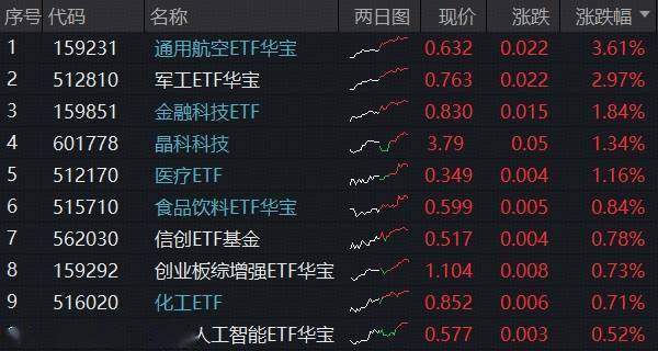 2025年最后5个交易日,沪指7连阳向4000点迈进,深证成指、创业板指录得5连涨,两市成交额小幅放量至1.92万亿元,全市场超3700只个股上涨。 | 序号 代码 | | 名称 | 内日图 | 现价 | 涨跌 | 涨跌幅 | | --- | --- | --- | --- | --- | --- | --- | | 1 | 159231 | 通用航空ETF华宇 | | 0.632 | 0.022 | 3.61% | | 2 | 512810 | 年工ETF华宇 | | 0.763 | 0.022 | 2.97% | | 3 | 159851 | 金融科技ETF | | 0.830 | 0.015 | 1.84% | | 4 | 601778 | 晶科科技 | | 3.79 | 0.05 | 1.34% | | 5 | 512170 | 医疗ETF | | 0.349 | 0.004 | 1.16% | | 6 | 515710 | 食品饮料ETF华宇 | | 0.599 | 0.005 | 0.84% | | 7 | 562030 | 信创ETF基金 | | 0-517 | 0.004 | 0.78% | ...