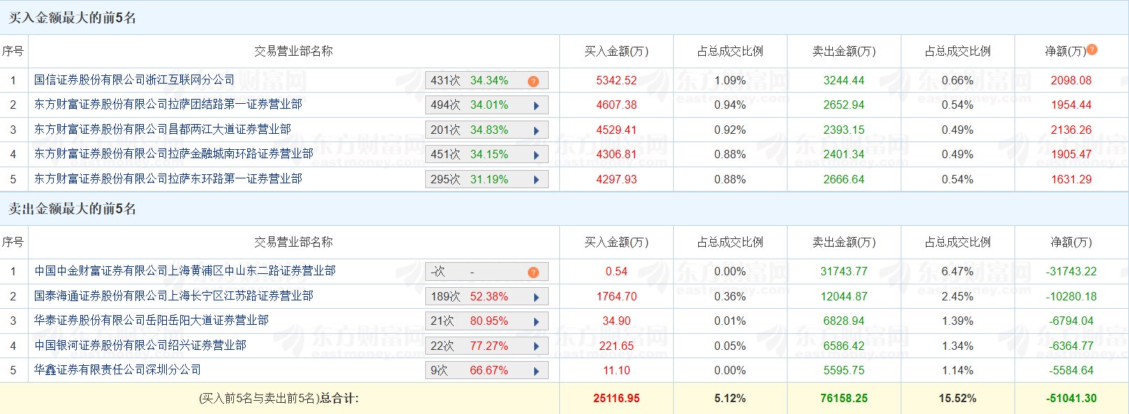 | 序号 | 交易营业部名称 | | | 买入金额(万) | 占总成交比例 | | --- | --- | --- | --- | --- | --- | | 1 | 国信证券股份有限公司浙江互联网分公司 | 431次 34.34% | 2 | 5342.52 | 1.09% | | 2 | 东方财富证券股份有限公司拉萨团结路第一证券营业部 | 494次 34.01% | ▶ | 4607.38 | 0.94% | | 3 | 东方财富证券股份有限公司昌都两江大道证券营业部 | 201次 34.83% | ▲ | 4529.41 | 0.92% | | 4 | 东方财富证券股份有限公司拉萨金融城南环路证券营业部 | 451次 34.15% | ▲ | 4306.81 | 0.88% | | 5 | 东方财富证券股份有限公司拉萨东环路第一证券营业部 | 295次 31.19% | A | 4297.93 | 0.88% | | | 卖出金额最大的前5名 | | | | | | 序号 | 交易营业部名称 | | | 买入金额(万) | 占总成交比例 | | 1 | 中国中金财富证券有限公司上海黄浦区中山东二路证券 ...