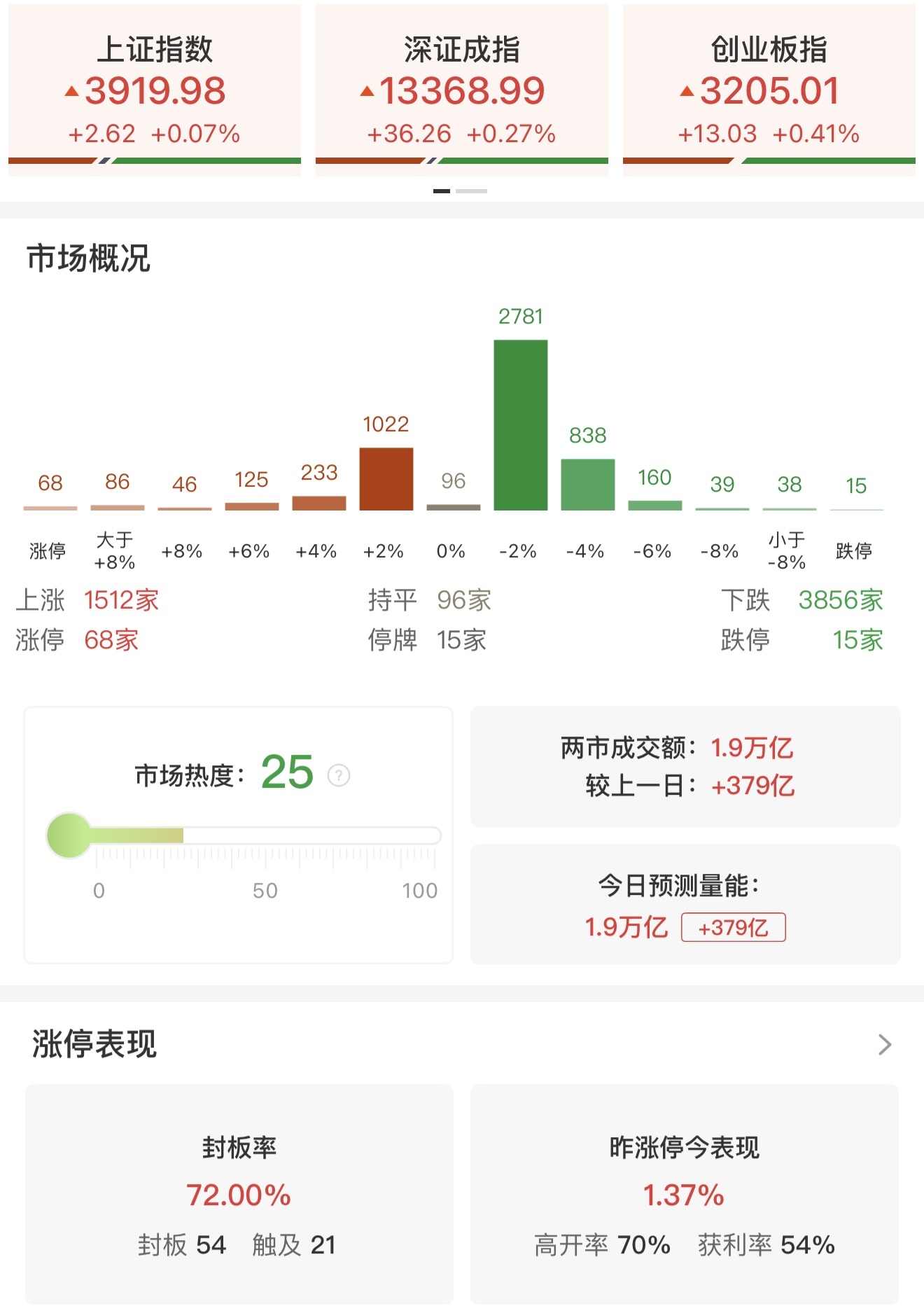 记者丨 江佩佩 李益文 见习记者张嘉钰 编辑丨谢珍 12月23日,A股 早盘震荡拉升, 截至收盘,沪指涨0.34%,深成指涨0.65%,创业板指涨0.78%。沪深两市半日成交额1.25万亿,较上个交易 日放量523亿。盘面上热点快速轮动,全市场超3300只个股下跌。 | 内地股票 L | | | | --- | --- | --- | | 行情 | 资金净流入 | 涨跌分布 | | 上证指数 | 深证成指 | 北证50 | | 3930.87 | 13419.60 | 1451.34 | | +13.50 +0.34% +86.87 +0.65% +2.05 +0.14% | | | | 科创50 | 创业板指 | 万得全A | | 1342.37 | 3217.02 | 6339.53 | | +7.12 +0.53% +25.04 +0.78% +20.44 +0.32% | | | | 沪深300 | 中证500 | 中证A500 | | 4635.13 | 7285.43 | 5610.22 | | +23.51 +0.51% +29.77 +0.41% +29.94 +0.54% | | | | 中 ...