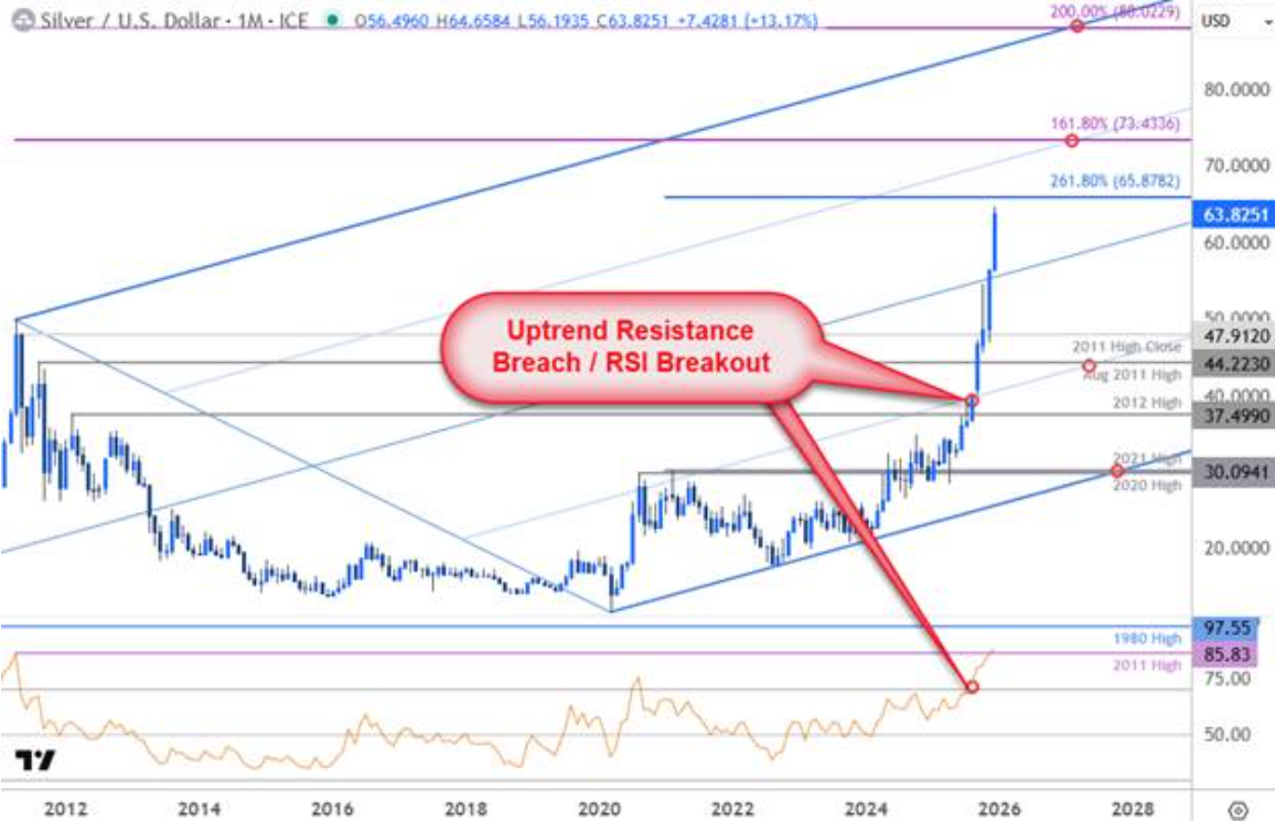 2025年贵金属板块表现强势,整体走势大幅跑赢各类主流风险资产。年初至今,铜价涨幅超30%,金价攀升约700%,铂金暴涨超100%。但表现最为亮眼的 当属白银。 有几点要点需要谨记。第一,白银价格突破阻力位后,相对强弱指数同步进入超买区间,往往预示着一轮涨势中最快、最迅猛的上涨阶段将至——这在强势 牛市中属于完全健康的走势。不少交易者因认定"涨幅过高的行情易遇挫"而错失机会,实则陷入了认知误区。要知道,该指标仅能反映行情上涨的动能强 度,只是对当下行情状态的直观观测,并无其他延伸解读意义。 白银需求始终保持旺盛,其在高速扩张的光伏产业、医疗应用及现代电子领域占据核心地位,为价格筑牢支撑。近期由人工智能热潮催生的市场上涨,进一 步提升了白银在各大核心产业中的应用价值。 尽管大宗商品走强早已在市场预期之中,但白银此番上涨的幅度与广度,印证了一个核心市场真相:强势上涨趋势下,资产的超买状态往往会延续远超市场 预期的时间——这也是健康且持久牛市阶段的标志性特征。本文将简要解析超买市场的运行特征。 截至12月末,现货白银年内涨幅近150%,稳居2025年资产涨幅榜首。8月白银价格突破上行趋势阻力位,成为多头行情的关键拐 ...