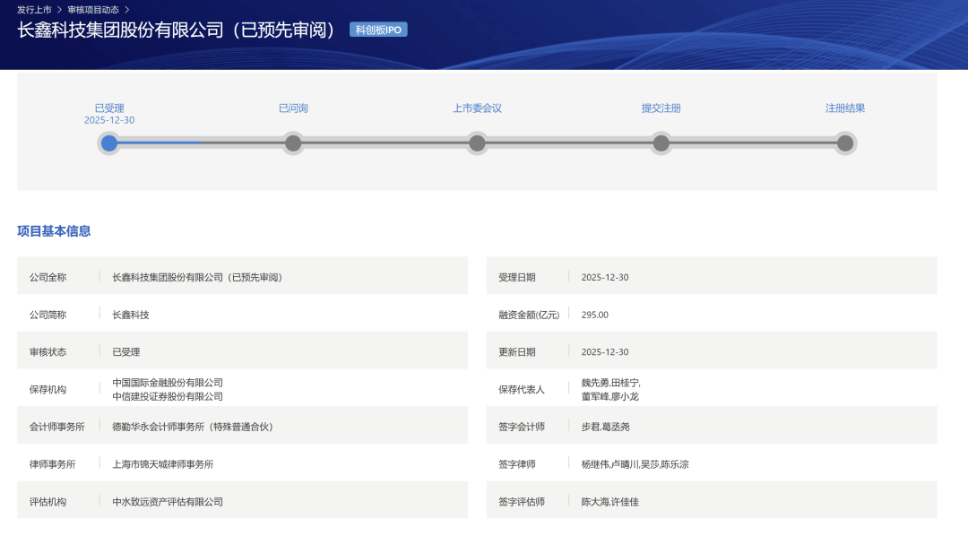 重磅IPO!长鑫科技,首单预先审阅项目获受理
