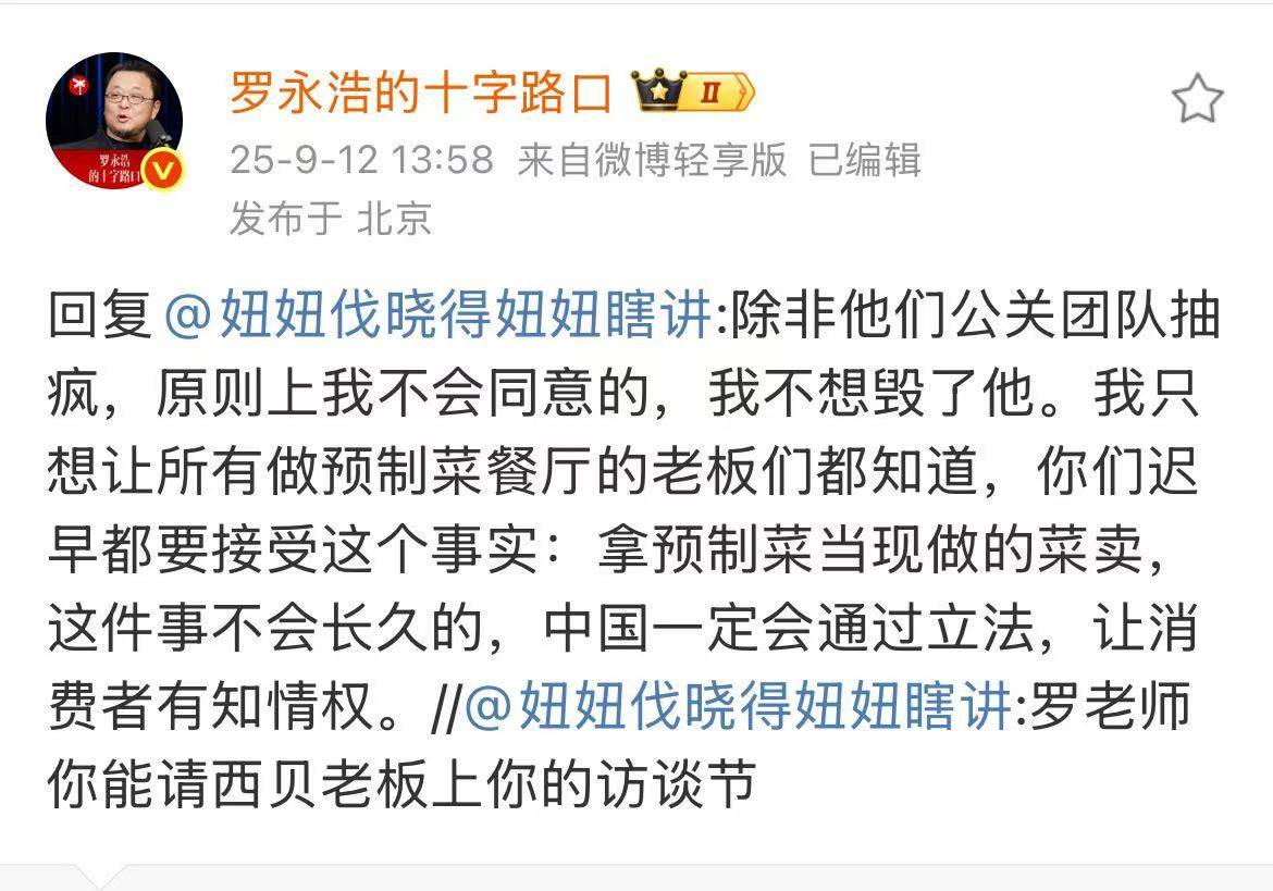 罗永浩:不会请西贝老板访谈,不想毁了他