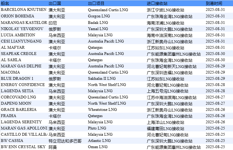 E-Gas系统:8月25日-8月31日当周中国LNG进口量约157万吨