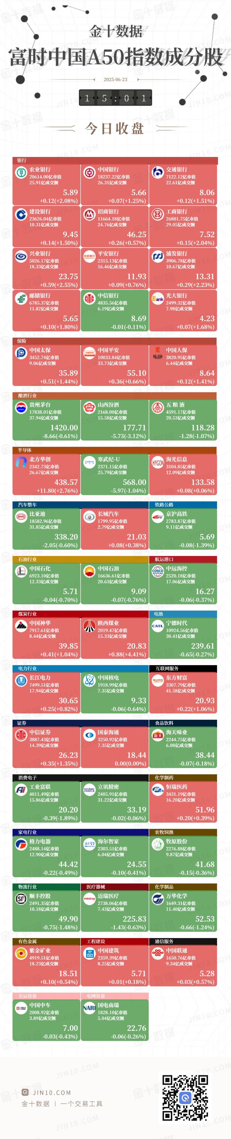 金十图示:2025年06月23日(周一)富时中国A50指数成分股午盘收盘行情一览:银行股多数走高、酿酒股、汽车股、石油股全线下跌