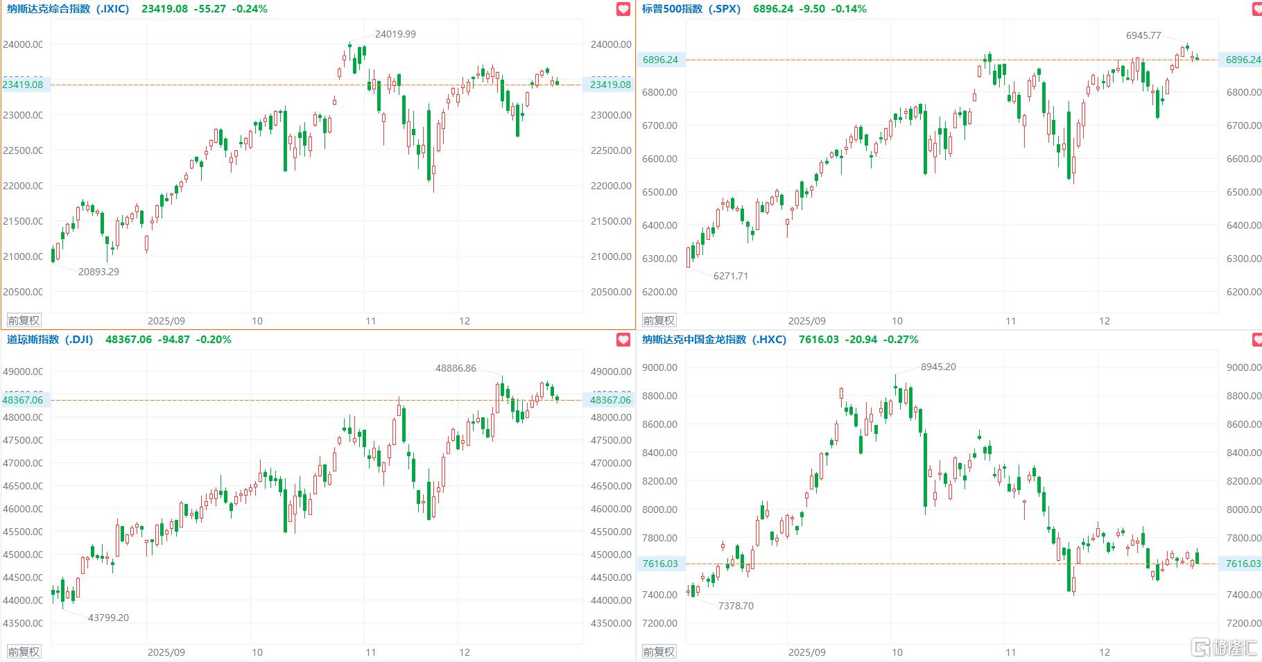 美股市场表现 - 美国股市三大股指在12月30日均小幅收跌并录得三连跌 道琼斯工业指数跌0.2%报48367.06点 标准普尔500指数跌0.14%报6896.24点 纳斯达克指数跌0.24%报23419.08点 [2][3][4] - 大型科技股涨跌互现 特斯拉跌超1% 英伟达和苹果跌幅不足1% Meta涨超1% 亚马逊、微软、谷歌微涨 [6] - 银行股全线走低但普遍跌幅不大 高盛和花旗集团跌近1% 摩根大通、摩根士丹利、美国银行、富国银行等微跌 [6] - 能源股集体上涨 西方石油涨超2% 斯伦贝谢和康菲石油涨逾1% 埃克森美孚和雪佛龙涨幅不足1% [7] - 芯片股涨跌不一 费城半导体指数跌0.13% 英特尔和迈威尔科技涨超1% 科天半导体、拉姆研究和应用材料跌逾1% 微芯科技微涨 闪迪跌逾1% [7] 中概股与贵金属 - 中概股涨跌不一 纳斯达克中国金龙指数跌0.27% 亿航智能涨超5% 老虎证券和百度集团涨超4% 小鹏汽车和蔚来涨逾3% 叮咚买菜跌逾7% 唯品会跌7% 华住集团、晶科能源和欢聚均跌超2% 京东集团跌近2% [8] - 贵金属走势分化 伦敦金现价格小幅上涨 多数时间在4300美元/盎司至4400美元/盎司之间波动 伦敦银现价格大幅上涨 收盘涨幅超过5% [9][10] - 铂和钯期货价格表现不一 NYMEX铂期货价格收盘涨4% NYMEX钯期货则接近平盘报收 [10] 美联储货币政策会议纪要 - 美联储公开的12月议息会议纪要显示内部存在明显分歧 12月10日会议以9票赞成3票反对通过降息25个基点的决议 将基准利率从3.75%—4%区间降至3.5%—3.75%区间 这是2019年以来异议数量最高的一次 [11][12] - 会议纪要显示“大多数”与会者支持12月会议降息 而“一些”人则倾向于维持利率不变 部分支持降息的人士认为决定本身十分微妙 他们同样也可以支持维持利率不变 [12] - 对于未来政策 多数官员认为如果通胀如预期回落 进一步降息是合适的 但也有一些官员明确表示利率应当在12月会议之后“在一段时间内”维持不变 [12] - 工作人员经济展望预测 与10月预测相比 到2028年实际GDP增速预计将略有加快 主要因金融市场状况预计将提供更大支持以及潜在产出增长预期增强 预计到2028年GDP增速将保持在潜在增长率之上 失业率将在今年之后逐步下降 到2027年将略低于对自然失业率的估计 [13] - 工作人员对2025年和2026年的通胀预测略低于10月份的预测 但对2027年和2028年的预测则相近 预计关税上涨将在今年和明年继续给通胀带来上行压力 此后通胀预计将回归反通胀趋势并于2028年降至2% [13] - 在会议纪要公布后 交易员维持对美联储2026年内两次降息的押注 而非12月初预期的三次 [2][13]