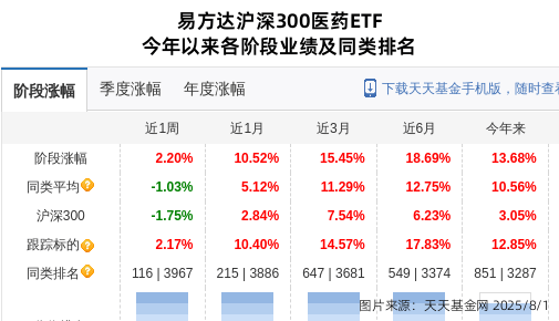 恒瑞医药股价表现 - 8月1日收盘价大跌2 53% [1] - 近1周涨幅2 20%,近1月涨幅10 52%,近3月涨幅15 45%,近6月涨幅18 69%,今年以来涨幅13 68% [2] - 同期同类平均涨幅分别为-1 03%、5 12%、11 29%、12 75%、10 56%,沪深300指数涨幅分别为-1 75%、2 84%、7 54%、6 23%、3 05% [2] 恒瑞医药股东结构 - 易方达沪深300医药ETF为前十大股东,二季度减持 [1] - 公司注册资本63 79亿人民币,法定代表人孙飘扬 [1] 易方达基金产品表现 - 易方达沪深300医药ETF今年以来收益率13 68%,同类排名851/3287 [1][2] - 跟踪标的指数同期涨幅12 85% [2] 基金经理背景 - 易方达沪深300医药ETF基金经理为余海燕,经济学硕士 [4] - 余海燕曾任汇丰银行信用风险分析师、华宝兴业基金经理,2013年起管理多只指数基金 [5] 易方达基金股权结构 - 公司成立于2001年4月,董事长刘晓艳,总经理吴欣荣 [6] - 主要股东包括盈峰集团(22 65%)、粤财信托(22 65%)、广发证券(22 65%)、广晟控股(15 10%)等 [6]