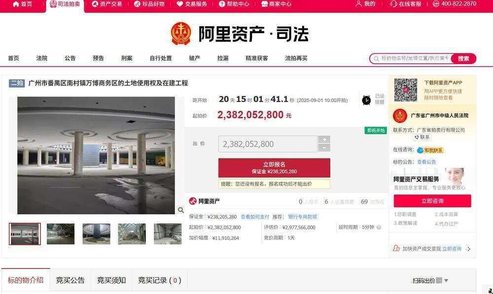 8月11日晚,阿里资产平台上架一则拍卖信息,此前因无人报名流拍的广州市番禺区南村镇万博商务区土地使用权及在建工程再度挂牌上架,起拍价约23.82 亿元。相较于首次挂牌时的29.78亿元评估价,此次挂牌价打了8折。 标的位于番禺区汉溪大道东下方,属万博商圈的中心位置,用地面积约7万平方米,商业体计容建筑面积约8万平方米。据羊城晚报记者此前的走访报道,标 的为地下共4层的在建工程,包括两层商铺和两层停车场,目前暂无人施工,仅有两位安保人员巡查。 n, 803 22 and 1 12 t And Call Beach Beach 436-1 II ( 2017/09/ 1 11 11 11 11 11 11 11 12 7 2 2 is a 4 the state AAT 2 te 191 The B al 8 3 . 7月28日上午,该项目在阿里资产平台首次挂牌拍卖,起拍价约29.78亿元,但由于无人报名参与,在经过24小时的限时竞价后,项目流拍。 本次挂牌距首次流拍仅过去不到两周时间,据阿里资产平台信息,二拍将于2025年9月1日10时开始。 ...