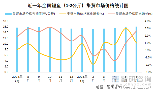 2025年6月全国鲤鱼(1-2公斤)集贸市场价格当期值16.15元/公斤,同比增长2.7%