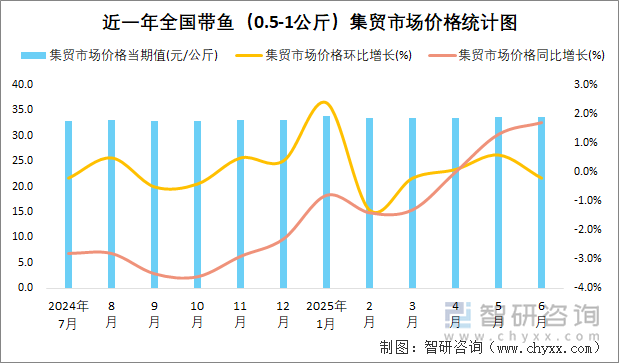 2025年6月全国带鱼(0.5-1公斤)集贸市场价格当期值33.6元/公斤,同比增长1.7%