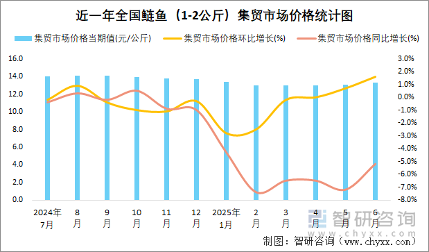 相关报告:智研咨询发布的《2025-2031年中国鲤鱼行业市场分析研究及未来前景研判报告》 2025年6月,全国鲤鱼(1-2公斤)集贸市场价格当期值为16.15元/公斤,比2025年5月上涨0.15元/公斤, 环比增长1%,降幅减少2个百分点,同比增长2.7%,增幅增加1.7个百分点。 数据来源:国家统计局 ...