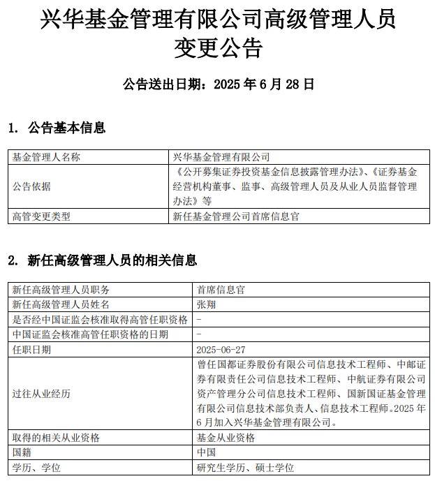| 基金管理人名称 | 兴华基金管理有限公司 | | --- | --- | | | 《公开募集证券投资基金信息披露管理办法》、《证券基金 | | 公告依据 | 经营机构董事、监事、高级管理人员及从业人员监督管理 | | | 办法》等 | | 高管变更类型 | 新任基金管理公司首席信息官 | 中国经济网北京6月30日讯 近日,兴华基金管理有限公司发布高级管理人员变更公告。公告称,张 翔任公司首席信息官。 张翔曾任国都证券股份有限公司信息技术工程师、中邮证券有限责任公司信息技术工程师、中航证 券有限公司资产管理分公司信息技术工程师、国新国证基金管理有限公司信息技术部负责人、信息技术 工程师。2025年6月加入兴华基金管理有限公司。 | 新任高级管理人员职务 | 首席信息官 | | --- | --- | | 新任高级管理人员姓名 | 张翔 | | 是否经中国证监会核准取得高管任职资格 - | | | 中国证监会核准高管任职资格的日期 | | | 任职日期 | 2025-06-27 | | 过往从业经历 | 曾任国都证券股份有限公司信息技术工程师、中邮证 券有限责任公司信息技术工程师、中航证券有限公司 | | | ...