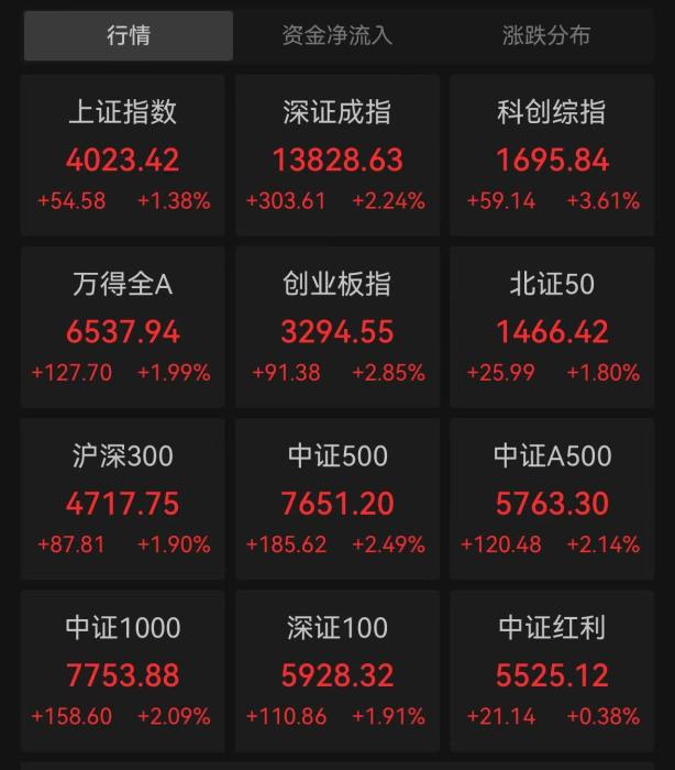 中新网1月5日电 1月5日,2026年首个交易日,A股三大股指集体上涨,沪指重返4000点上方。 | 行情 | 资金净流入 | 涨跌分布 | | --- | --- | --- | | 上证指数 | 深证成指 | 科创综指 | | 4023.42 | 13828.63 | 1695.84 | | +54.58 +1.38% +303.61 +2.24% +59.14 +3.61% | | | | 万得全A | 创业板指 | 北证50 | | 6537.94 | 3294.55 | 1466.42 | | +127.70 +1.99% +91.38 +2.85% +25.99 +1.80% | | | | 沪深300 | 中证500 | 中证A500 | | 4717.75 | 7651.20 | 5763.30 | | +87.81 +1.90% +185.62 +2.49% +120.48 +2.14% | | | | 中证1000 | 深证100 | 中证红利 | | 7753.88 | 5928.32 | 5525.12 | | +158.60 +2.09% +110.86 +1.91% +21.14 ...