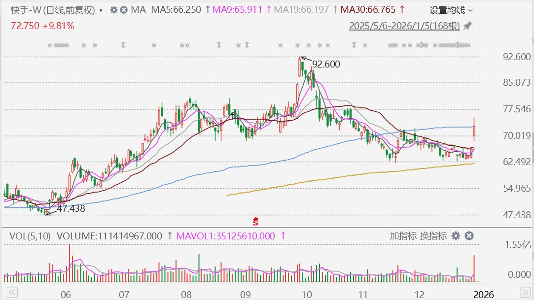 域的NonaBanana。 【1月5日快手股价表现亮眼,盘中涨幅超13%】1月5日,快手(1024.HK)表现出色,盘中一度涨超 13%,报75.25港元,创3月以来最大升幅,截至目前成交额放大至81亿港元。 数据显示,快手人工智能 (AI)模型可灵(Kling)在海外市场大受。截至1月2日,其在韩国所有图形和设计类应用中排名第一,在美 国、土耳其、越南等市场位列前十。 去年12月,可灵下载量达50万次,收入达90万美元。分析认为, 受益于韩美下载量增长,快手海外收入增长强劲,可灵AI变现速度快于预期。 快手可灵AI去年底"连续 升级",统一多模态O1 + 2.6音画同出 + 数字人2.0。12月初,全新产品"可灵O1"发布,是首个大一统多 模态创作工具,被部分人视为AI影片领域的NonaBanana。 本文由 AI算法生成,仅作参考,不涉投资建议,使用风险自担 本文由 Al 算法生成,仅作参考,不涉投资建议,使用风险自担 和讯财经 hexun.co 和而不同 迅达天下 扫码查看原文 ...