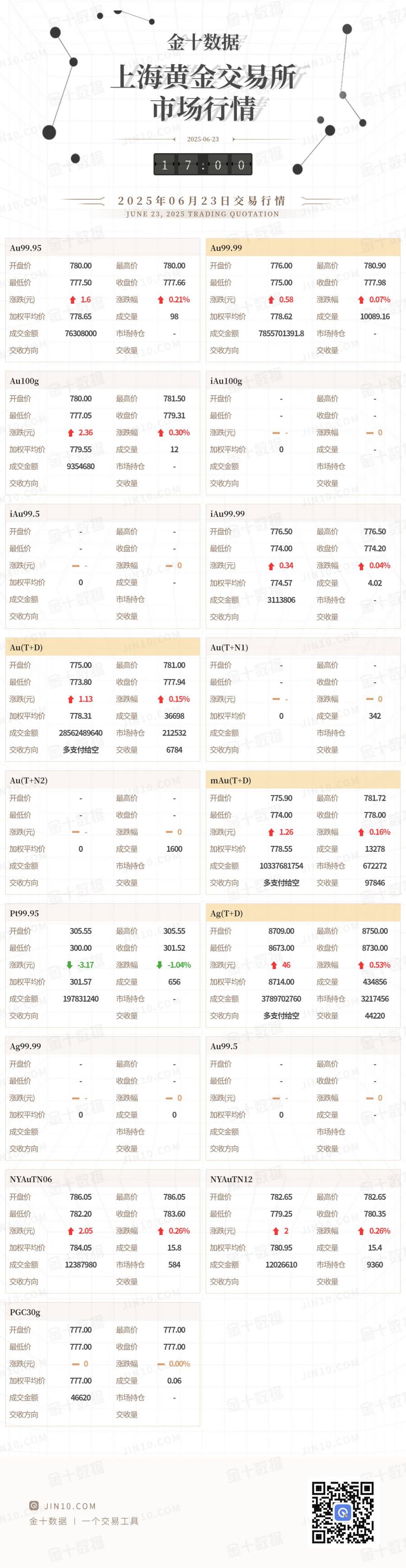 金十图示:2025年06月23日(周一)上海黄金交易所市场行情 @ JIN10.COM 金十数据 | 一个交易工具 | Au100g | | | | iAul | | --- | --- | --- | --- | --- | | 开盘价 | 780.00 | 最高价 | 781.50 | 开盘 | | 最低价 | 777.05 | 收盘价 | 779.31 | 最低 | | 涨跌(元) | 1 2.36 | 涨跌幅 | 1 0.30% | 涨跌 | | 加权平均价 | 779.55 | 成交量 | 12 | 加权 | | 成交金额 | 9354680 | 市场特色 | | 成交 | | 交收方向 | | 交收量 | | 交收 | | iAu100g | | | | --- | --- | --- | | 开盘价 | | 最高价 | | 最低价 | . | 收盘价 | | 涨跌(元) | | 涨跌幅 0 | | 加权平均价 | 0 | 成交量 | | 成交金额 | | 市场持仓 | | 交收方向 | | 交收量 | | iAu99.99 | | | | | iAu99.99 | | | | | --- | - ...